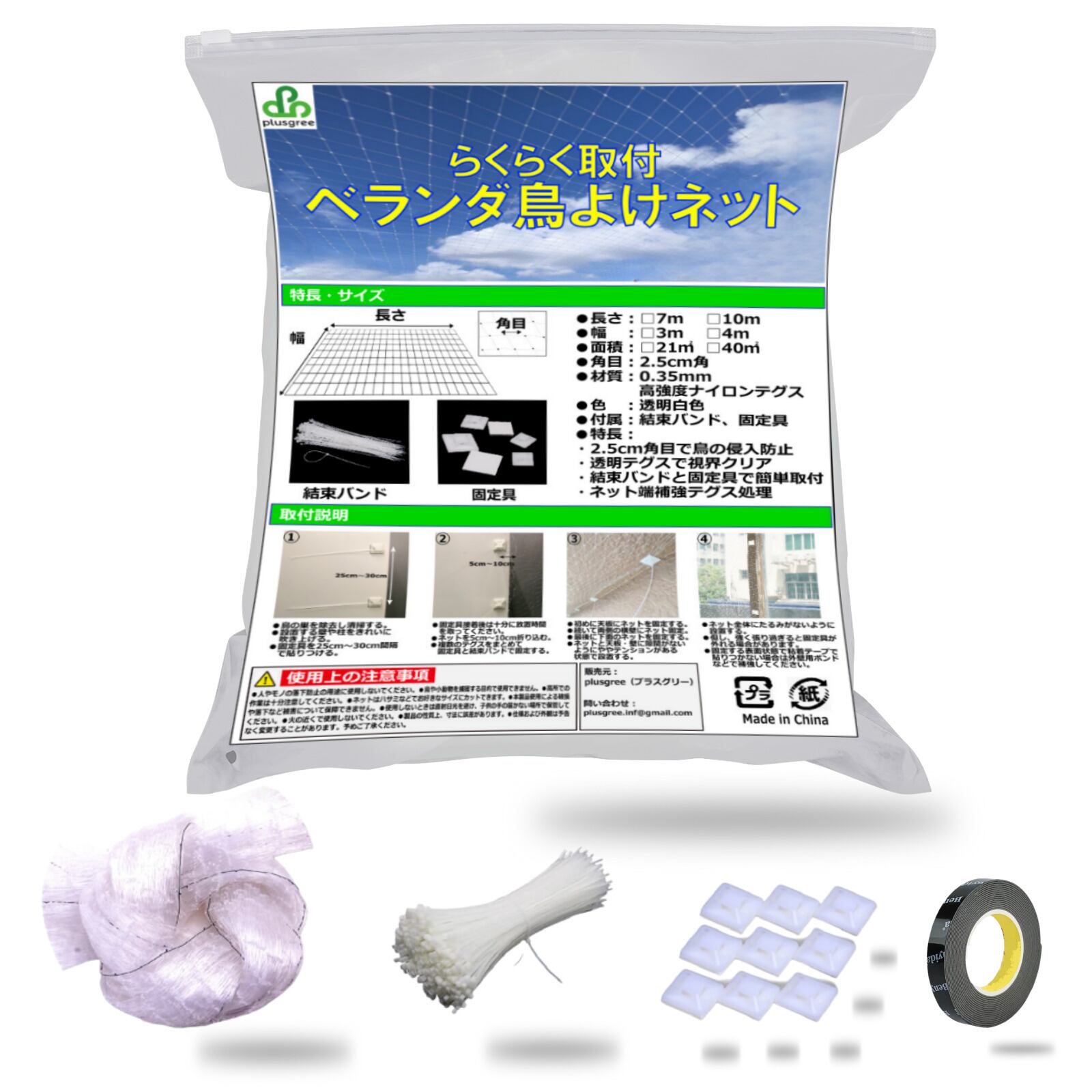 plusgree鳥よけネットは、サイズ3m×7m、付属の結束バンド100本、固定具50個、図解説明書で簡単に設置できます。